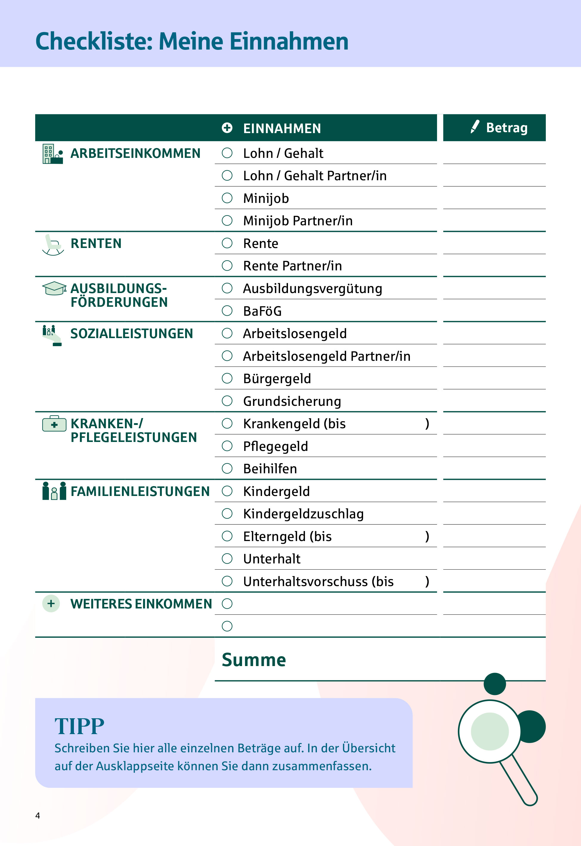 Mit dem einfachen Haushaltsbuch gelingt jedem der Überblick über die eigenen Finanzen. Einprägsame Symbole, Farben und Beispiele weisen durch den Ratgeber und begleiten Sie zu Ihrem monatlichen Ergebnis. Wichtige Tipps in einfacher Sprache ergänzen die Broschüre. Die aktuelle Ausgabe ist in Kooperation mit der Landesarbeitsgemeinschaft Schuldner- und Insolvenzberatung Berlin entstanden. „Das einfache Haushaltsbuch“ richtet sich an alle, die mit einem Haushaltsbuch erstmals starten möchten. Menschen mit geringen Deutschkenntnissen können das einfache Haushaltsbuch außerdem in Englisch, Französisch, Arabisch, Ukrainisch und Russisch nutzen.