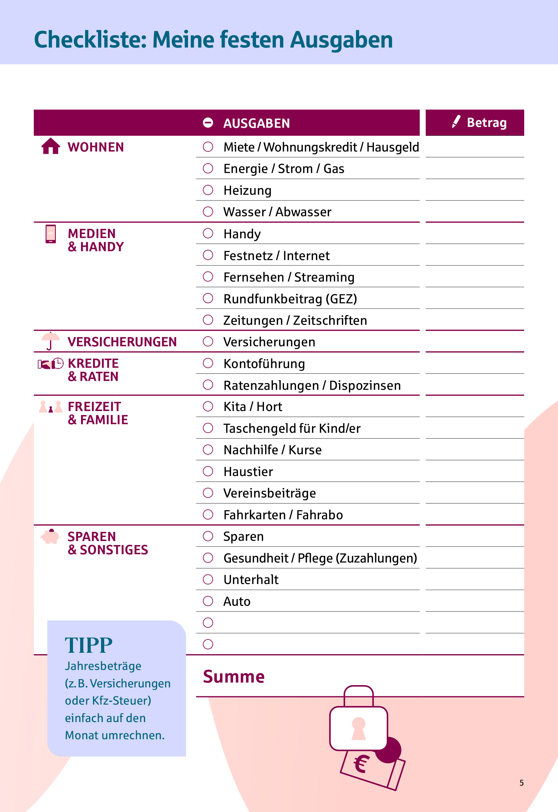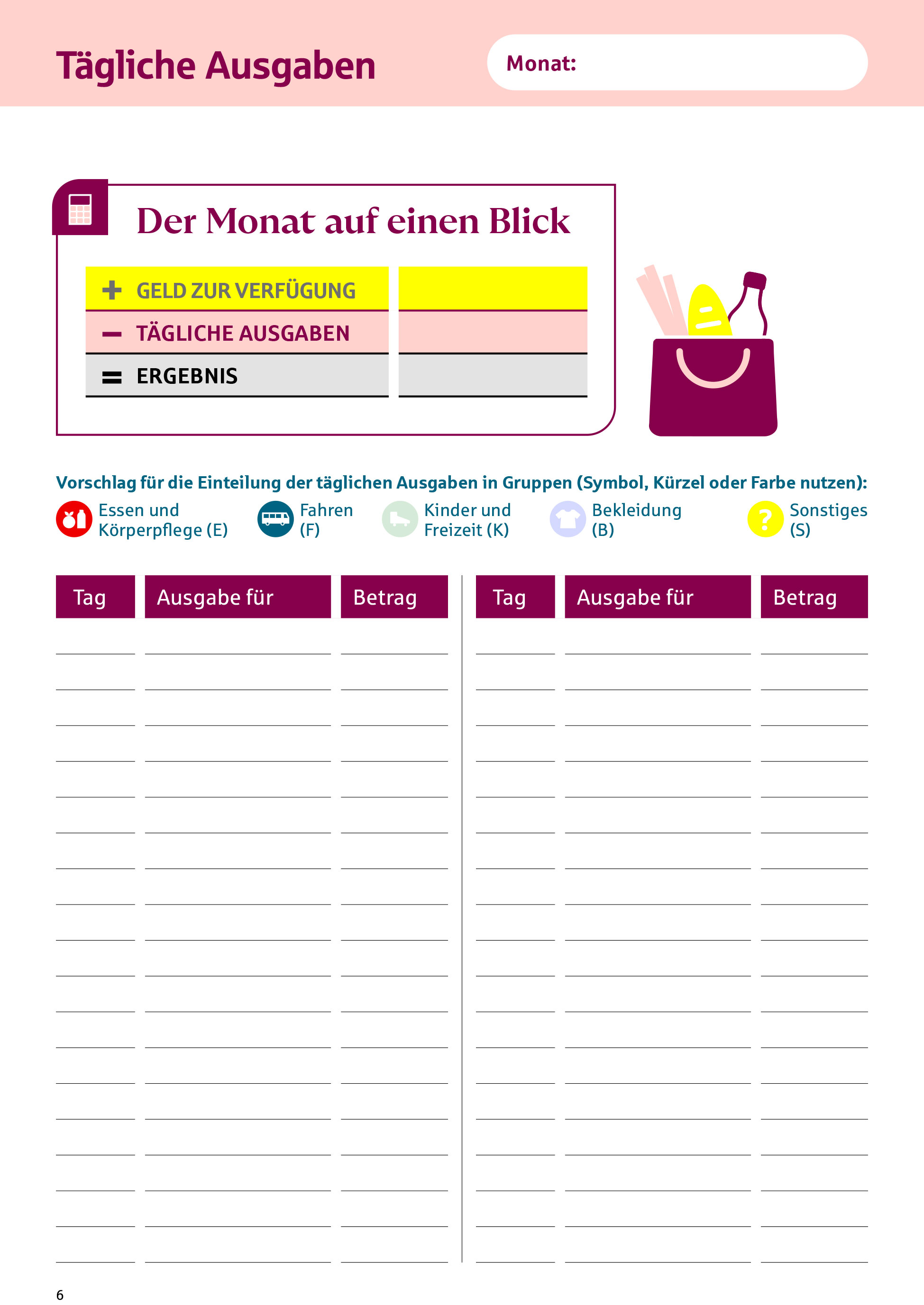 Das kostenlose Haushaltsbuch unterstützt Sie bei der Budgetkontrolle. Schon nach wenigen Wochen können Sie mithilfe des Ratgebers und Ihrer eigenen Zahlen aufdecken, wo sich etwas einsparen lässt. So verschaffen Sie sich finanzielle Spielräume und haben für künftige Finanzentscheidungen eine solide Grundlage.