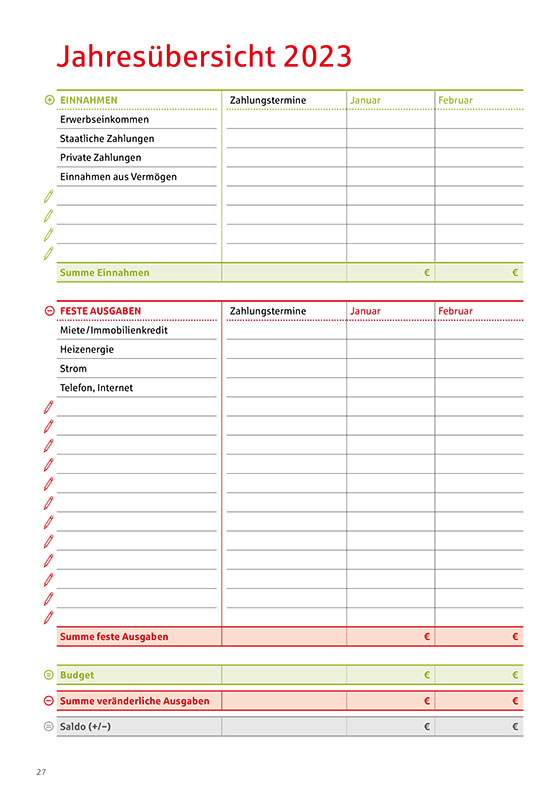 Für eine gute Finanzübersicht sollten Sie neben Ihren täglichen, veränderlichen Ausgaben auch Ihre festen Ausgaben und Ihre tatsächlichen Einnahmen im Blick haben. Auch hier liefert der Haushaltskalender Ihnen die passenden Tabellen und Übersichten. So wird es ein Leichtes für Sie, jeden Monat Einnahmen und Ausgaben in der Balance zu halten.
